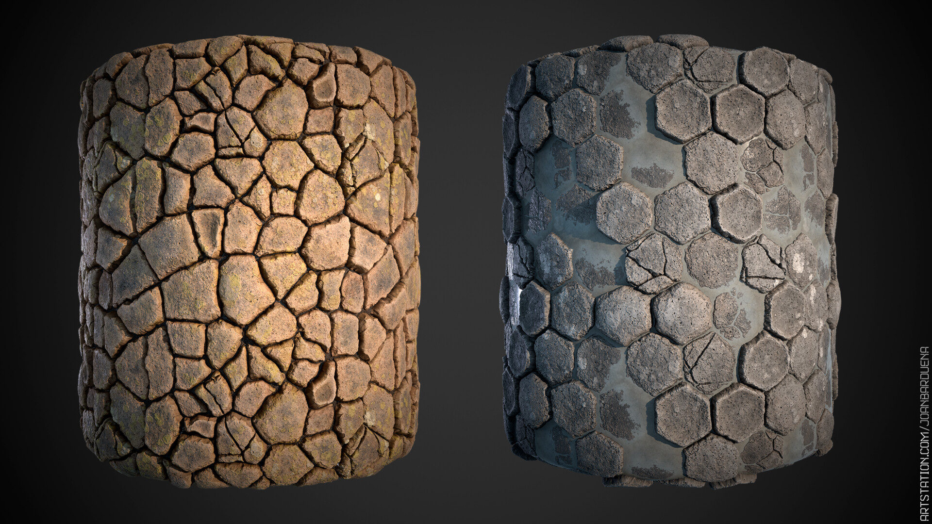 The material has parameters to change type of rock, grass, surface, liquen, water, etc.